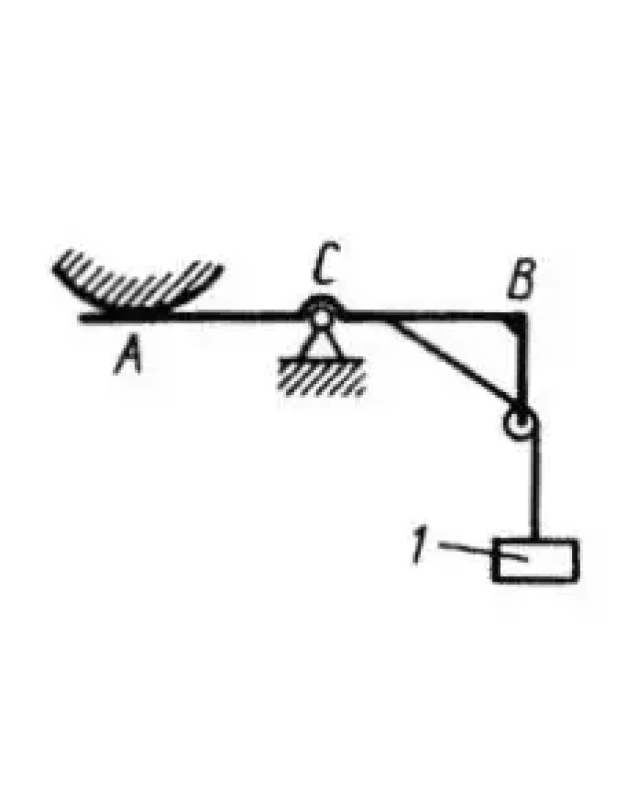 Определить горизонтальную составляющую реакции опоры С горизонтальной балки АВ, если к ней подвешен груз 1 весом 18 кH. (Ответ 0)