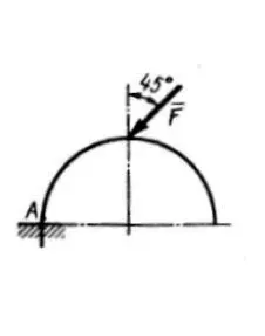 Арка, имеющая форму полуокружности, жестко заделана в точке А. Определить момент в заделке, если сила F =100Н. (Ответ 0)