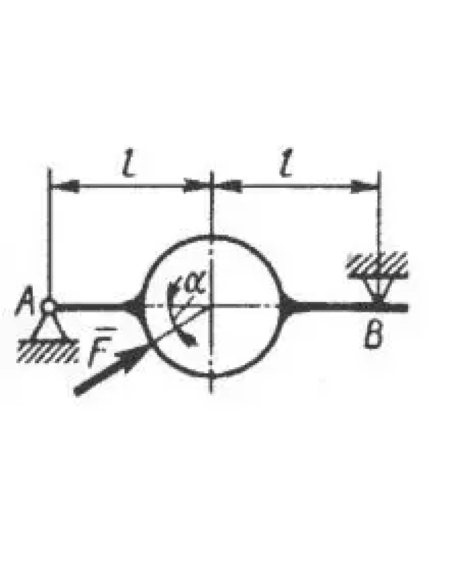 Стержень АВ жестко связан с диском. Определить в кН реакцию опоры В, если сила F = 24 кН. угол ?=30°. (Ответ 6,0)
