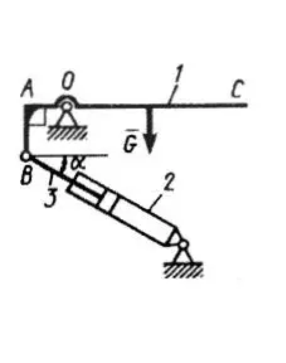 Лестница 1 весом G = 2 кН удерживается в горизонтальном положении с помощью силового гидроцилиндра 2. Определить в кН силу, действующую на шток 3 гидроцилиндра, если момент силы М0 (G) = 2 кН·м, угол ?=30°, расстояние AО = AB = 0,5 м. (Ответ 2,93)