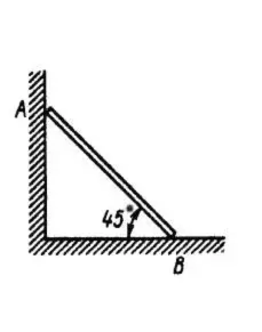 Однородный брус АВ опирается в точке А на гладкую стену, а в точке В на негладкий пол. Определить наименьший коэффициент трения скольжения между брусом и полом, при котором брус останется в указанном положении в покое. (Ответ 0,50)