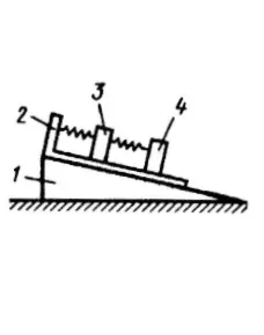 Призма 1 может двигаться по горизонтальной плоскости. Тело 2 скользит по ее верхней грани. Тела 3 и 4 связаны между собой и с телом 2 пружинами. Определить число обобщенных координат системы, если все тела движутся в одной вертикальной плоскости. (Ответ 4)