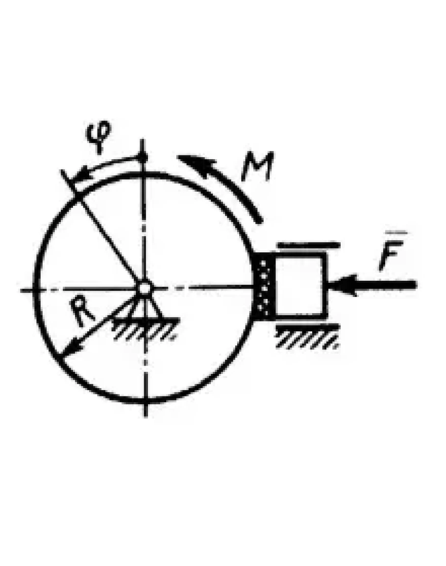 К цилиндру, который вращается под действием пары сил с моментом М = 20 Н • м, прижимается тормозная колодка силой F = 100Н. Определить обобщенную силу, соответствующую обобщенной координате ? если коэффициент трения скольжения между колодкой и цилиндром f = 0,4, a R = 0,4 м. (Ответ 4)