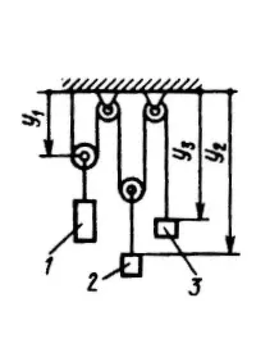 Грузы 1, 2, 3, массы которых m1 = 12 кг, m2 = 6 кг, m3 = 4 кг, перемещаются в вертикальной плоскости. Выбрав координаты у1 и у2 в качестве обобщенных, определить обобщенную силу, соответствующую координате y1. (Ответ 39,2)