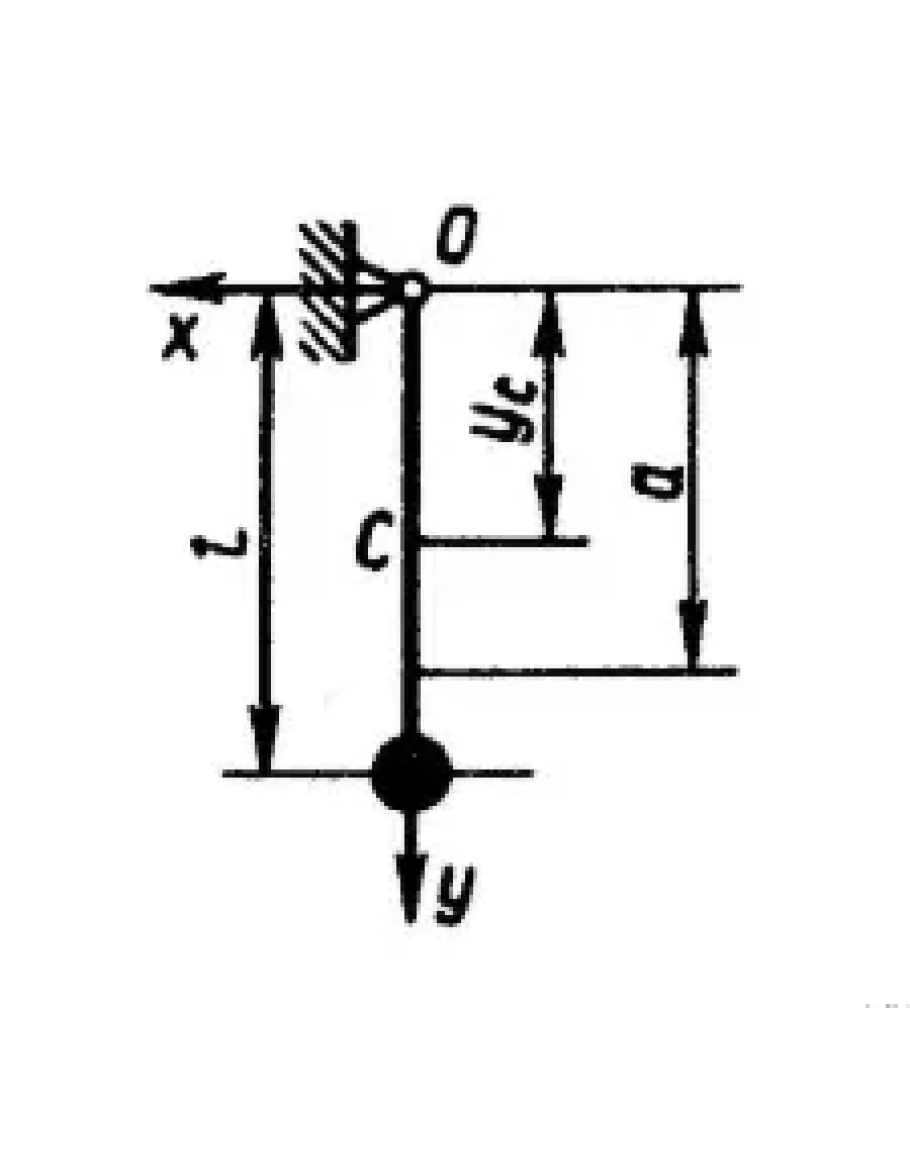 Найти расстояние а от центра удара до оси вращения О однородного стержня массой 0,8 кг и материальной точки массой 0,2 кг, закрепленной на конце стержня длиной l = 0,6 м. Расстояние от центра масс С до оси вращения ус = 0,36 м. Момент инерции IO = 0,168 кг • м2. (Ответ 0,467)