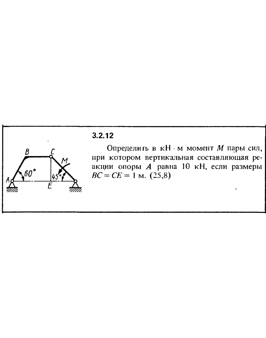 Определить в кН м момент М пары сил, при котором вертикальная составляющая реакции опоры А равна 10 кН, если размеры ВС = СЕ = 1 м.