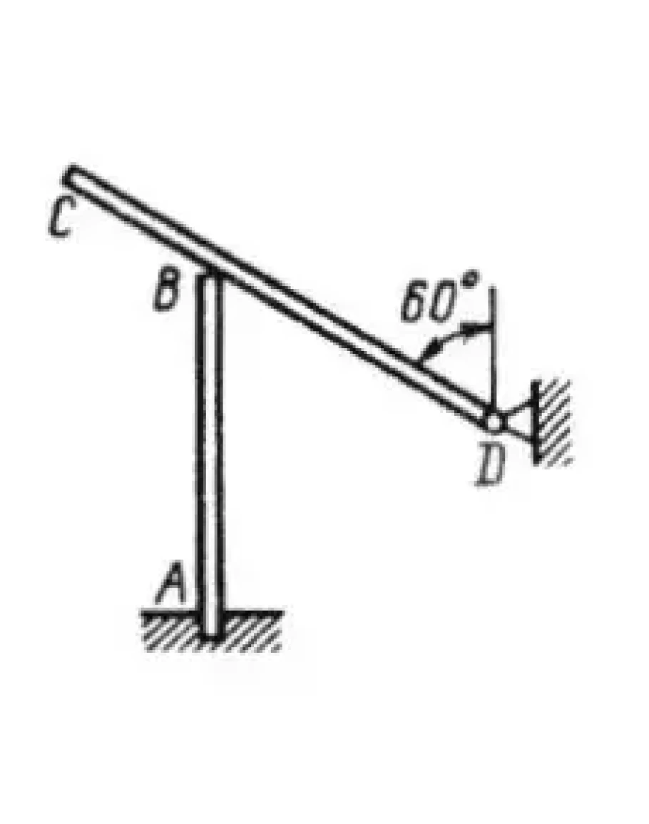 Однородный стержень CD весом 346Н опирается на вертикальную стойку АВ. Определить момент в заделке А, если размеры BD = 2 м, ВС = 1 м, АВ = 2 м. (Ответ 225)