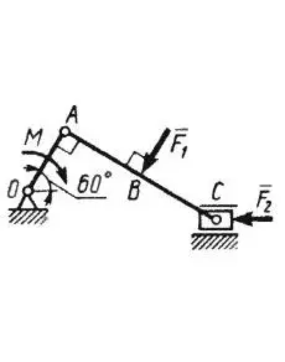 Кривошипно-ползунный механизм находится в состоянии равновесия под действием пары сил с моментом М, сил F1 = 200Н и F2 = 500Н. Определить силу воздействия поршня С на направляющую, если расстояния АВ = ВС = 30 см. (Ответ 404)