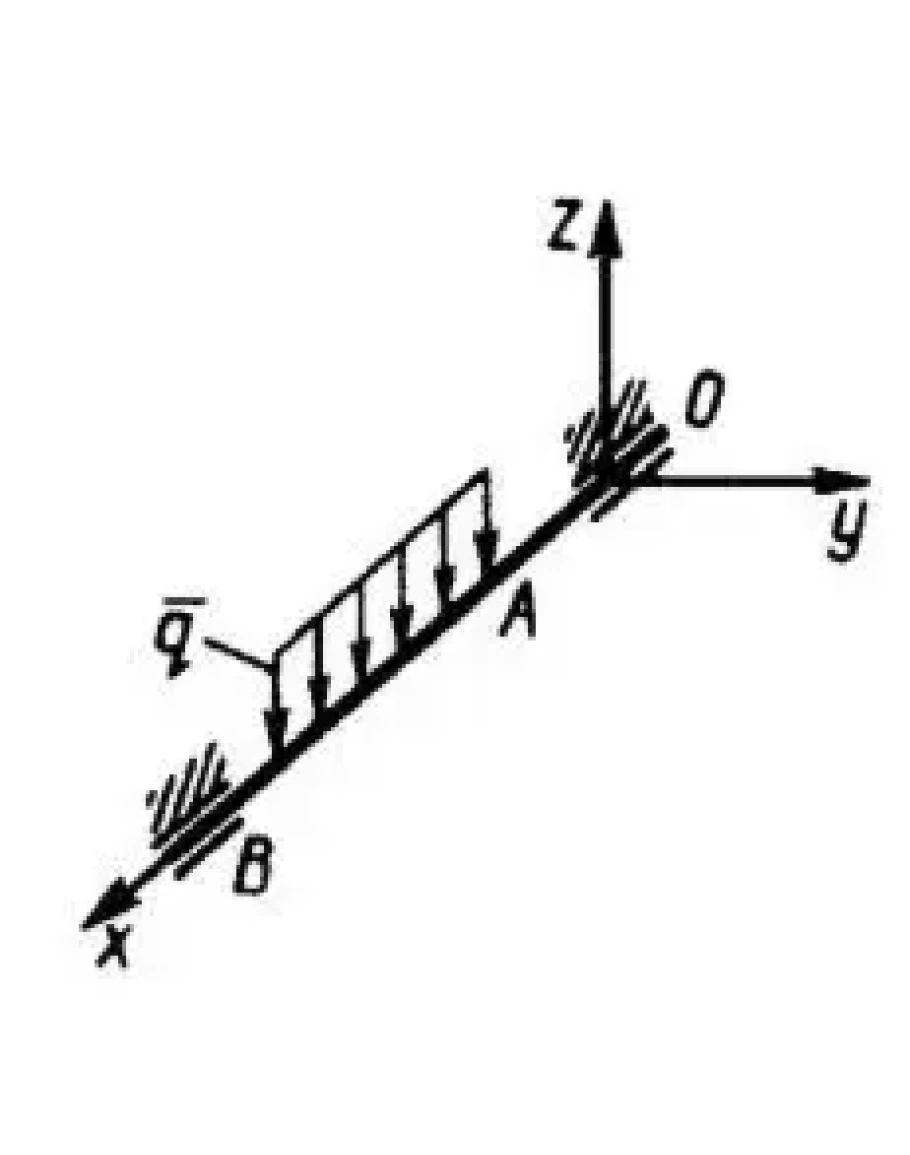 Определить момент распределенной нагрузки относительно оси Оу, если q ||Oz. Дано: q = 3Н/м, OA =2м,AB= 3м. (Ответ 31,5)