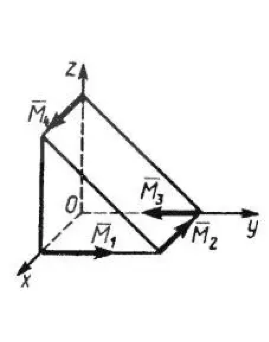 Определить модуль момента уравновешивающей пары сил для пространственной системы четырех пар сил, если М1 = М2 = М3 = М4 = 20Н·м. (Ответ 0)