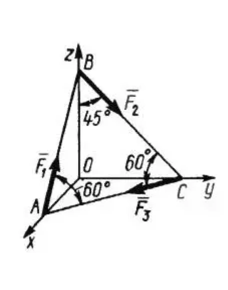 Тетраэдр ОABC находится под действием сил F1 = F2 = F3 = 10Н. Приняв за центр приведения точку В, определить модуль главного момента этих сил, если длина ребер АВ = ВС = АС = 2м. (Ответ17,3)