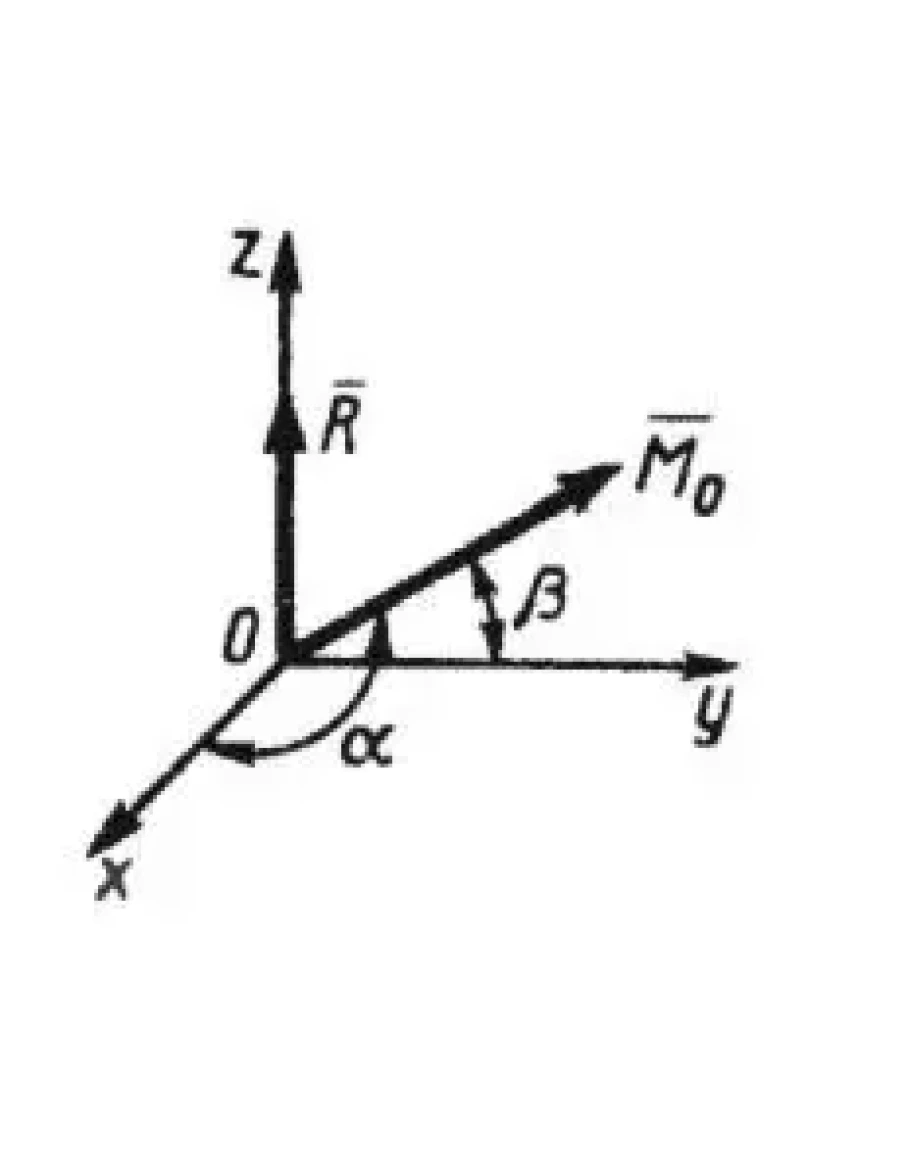 Главный вектор R направлен вдоль оси Oz, а главный момент М0 образует с осями Ох и Оу углы ?=60° и ?=45°. Определить скалярное произведение R•М0, если R = 1Н и М0 = 6Н•м. (Ответ 3)