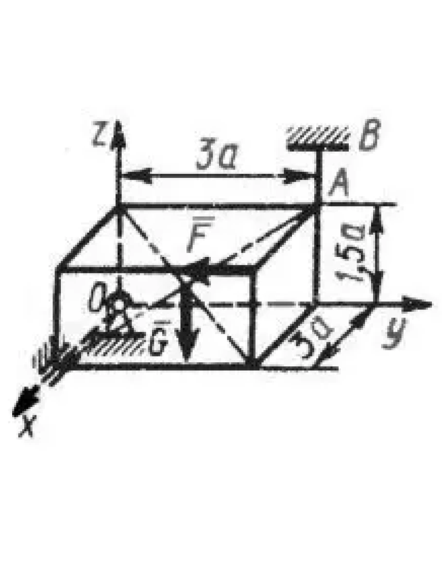 Тело весом G = 11 кН под действием наложенных связей и приложенной силы F = 3 кН находится в равновесии. Составить уравнение моментов сил относительно оси Ох, затем определить натяжение троса АВ, если размер а = 0,2 м. (Ответ 4•103)