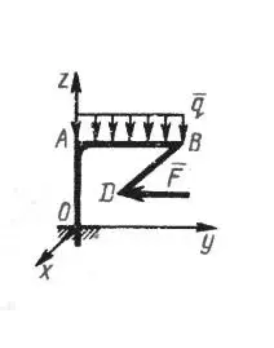 Фигурная балка OABD находится в равновесии. Определить составляющую в тоннах реакции заделки вдоль оси Oz, если дано: ОА = 1,7 м, АВ = 2 м, BD = 3,4 м, BD || Ох, сила F = 1 т и интенсивность распределенной нагрузки q = 2 т/м. (Ответ 4)