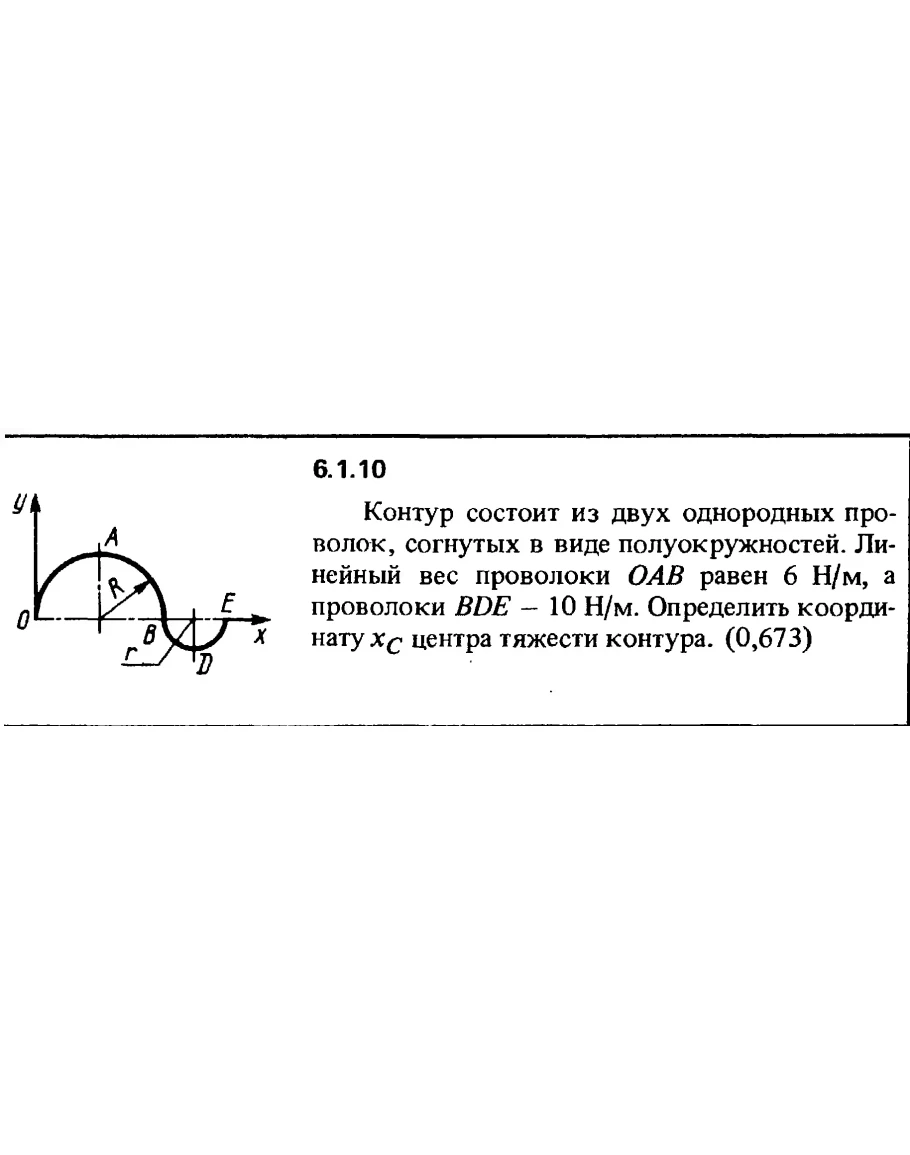Контур состоит из двух однородных проволок, согнутых в виде полуокружностей. Линейный вес проволоки ОАВ равен 6 Н/м, а проволоки BDE - 10 Н/м. Определить координату хС центра тяжести контура.