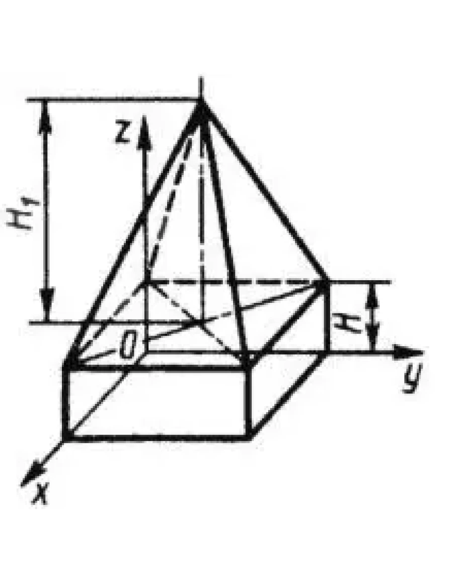 Определить координату zc центр тяжести однородного тела, состоящего из прямоугольного параллелепипеда и призмы, если высота H1 = 3Н = 1,2 м. (Ответ 0,45)