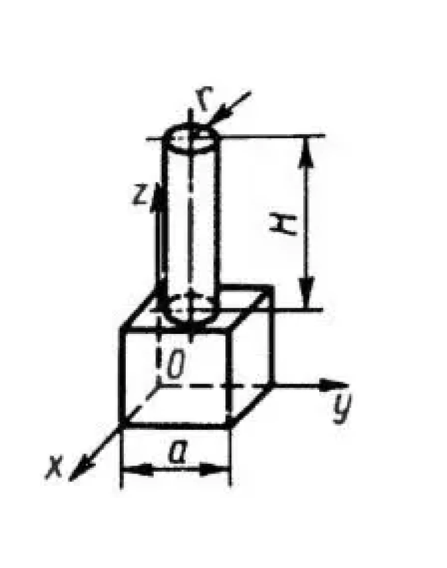 Определить статический момент относительно координатной плоскости Оху тела, состоящего из однородных куба и цилиндра, если размеры а = 0,4 м, r = 0,5 a, H = 2 а. (Ответ 9,32•10-2)
