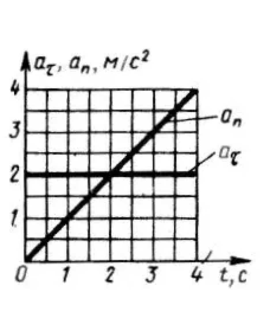 7.8.12. Даны графики ускорения а? = а? (t) и аn = an(t). Определить, какой угол в градусах образует полное ускорение с направлением скорости в момент времени t = 3 с. (Ответ 56,3)