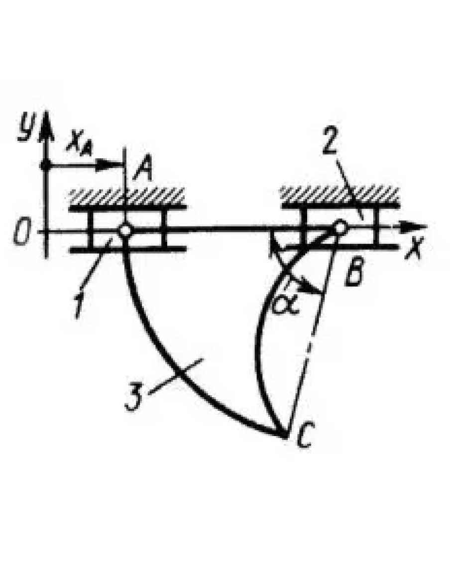 К ползунам 1 и 2, перемещающимся вдоль оси Ох по общей направляющей, прикреплено тело 3. Точка А движется по закону хА = 0,1t2. При t = 10 с определить скорость точки С, если расстояния А В = ВС = 0,3 м и угол ? = 75°. (Ответ 2)