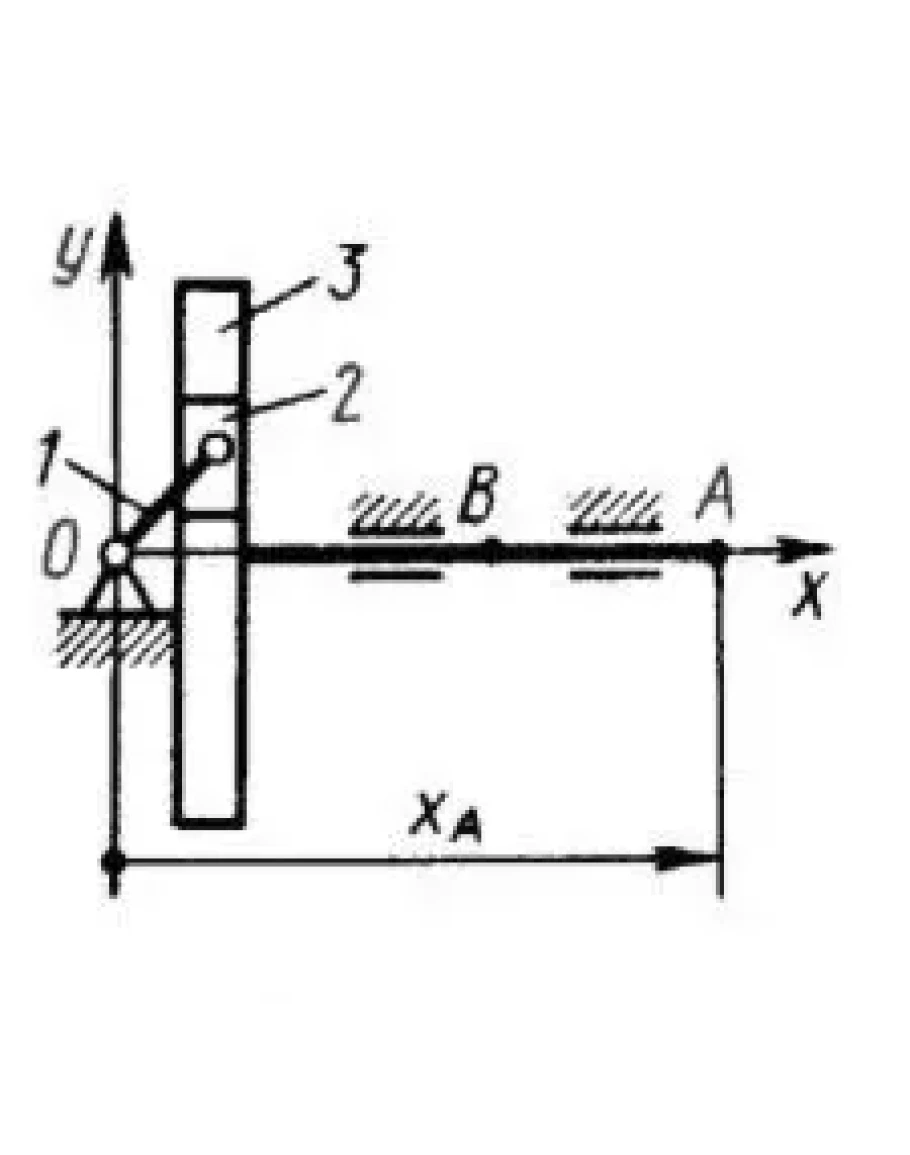 От кривошипа 1 с помощью ползуна 2 приводится в поступательное движение кулиса 3 по закону хА = 0,4 - 0,1 sin t2. Определить скорость точки В кулисы в момент времени t = 2 с. (Ответ 0,261)