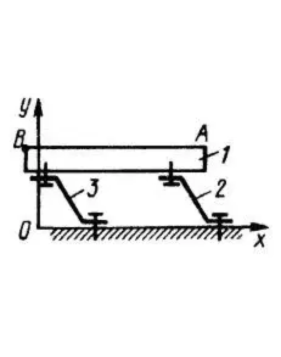 Вибролоток 1, закрепленный на двух плоских пружинах 2 и 3, совершает поступательное движение по закону ХА = 0,16 sin 50 ?t, уА = 0,12 sin 50 ?t, где хА и уА - в см. Определить скорость в см/с точки В вибролотка в момент времени t = 1 с, если АВ = 100 см.(Ответ 31,4)