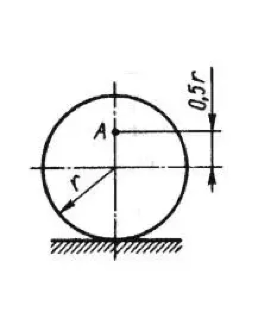 Определить угловую скорость колеса, если точка А имеет скорость vA= 10 м/с, а радиус колеса r = 0,2 м. (Ответ 33,3)