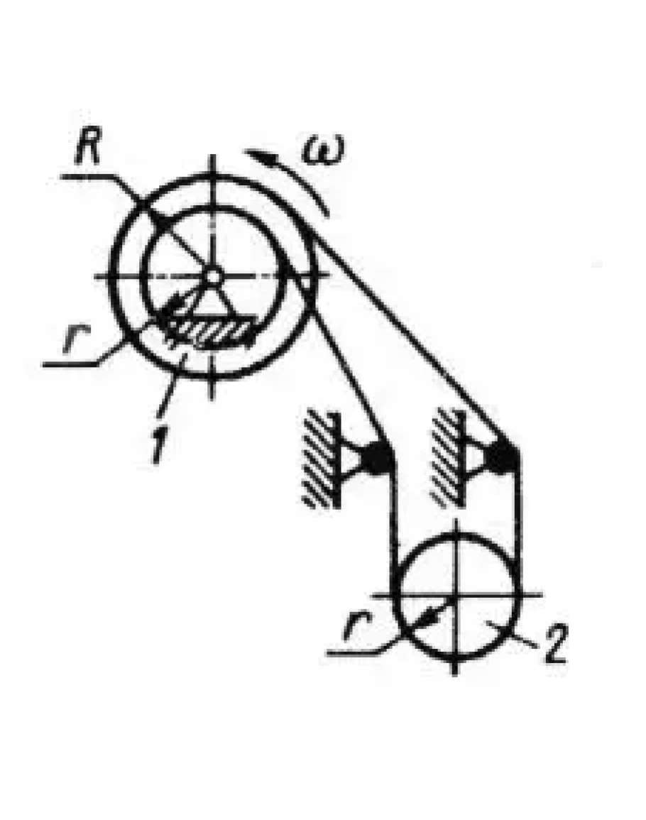Барабан лебедки 1 вращается с угловой скоростью ? = 6 рад/с. Определить угловую скорость поднимаемом трубы 2, если отношение радиусов r/R = 2/3. (Ответ 1,5)
