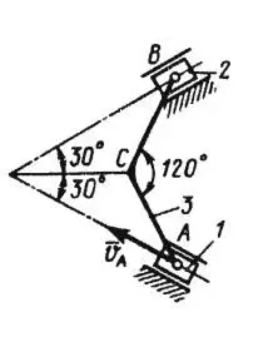Ползуны 1 и 2, соединенные шарнирами А и В с шатуном 5, движутся по неподвижным направляющим. Определить угловую скорость шатуна в момент, когда скорость точки А равна 0,2 м/с, если длины АС = ВС = 0,2 м. (Ответ 1,0)