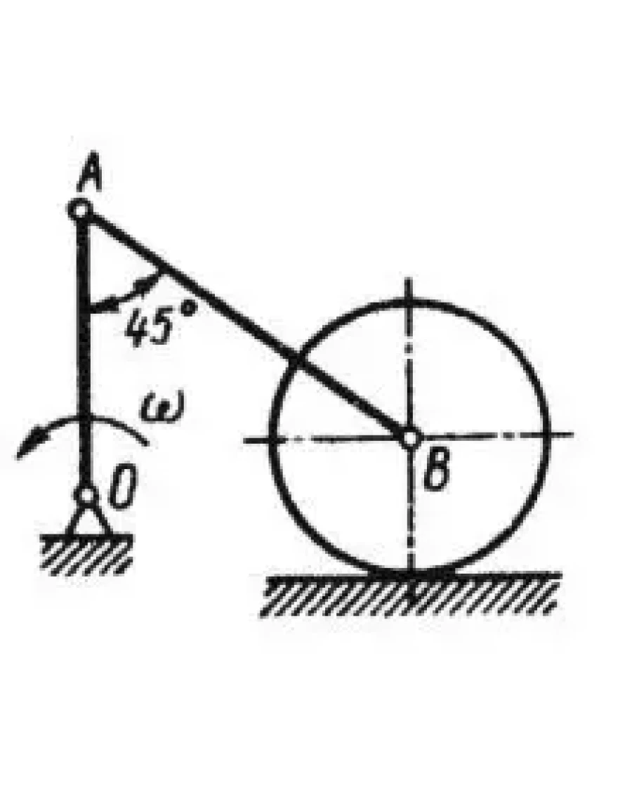 Определить угловое ускорение шатуна АВ кривошипно-ползунного механизма в данном положении, если кривошип ОА вращается с постоянной угловой скоростью ? = 10 рад/с, а длины звеньев ОА = 0,3 м, АВ = 0,45 м. (Ответ 94,3)