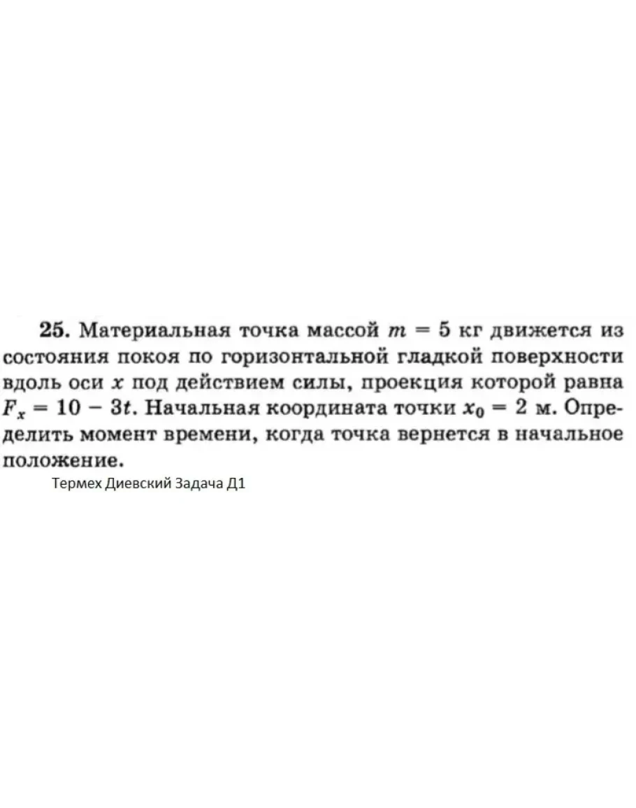 Решение задачи Д1 В 25. Материальная точка массой т = 5 кг движется из состояния покоя по горизонтальной гладкой поверхности вдоль оси х под действием силы, проекция которой равна Fx = 10 - 3t. Начальная координата точки х0 = 2 м. Определить момент времени, когда точка вернется в начальное положение.