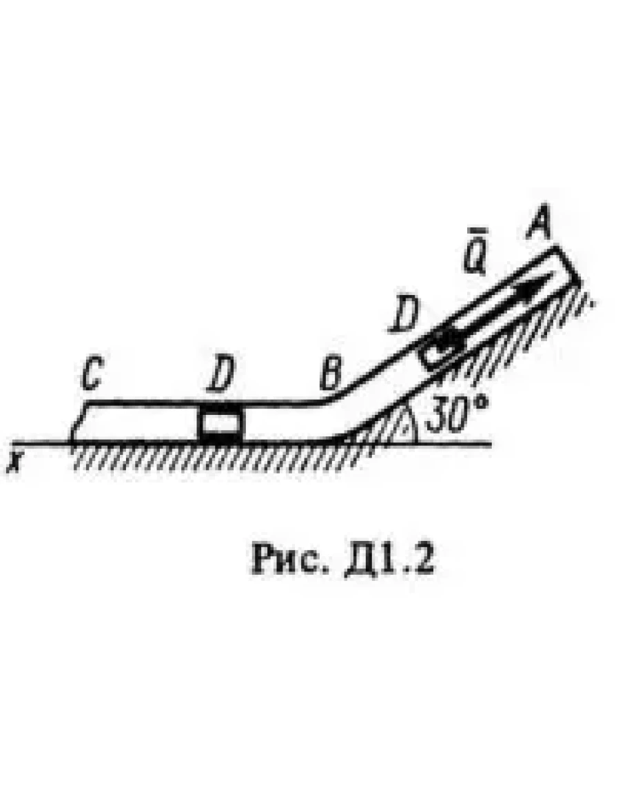Груз D массой m, получив в точке А начальную скорость v0, движется в изогнутой трубе ABC, расположенной в вертикальной плоскости; участки трубы или оба наклонные, или один горизонтальный, а другой наклонный (рис. Д1.0-Д1.9 табл. Д1). На рисунке АВ на груз кроме силы тяжести действуют постоянная сила Q (ее направление показано на рисунках) и сила сопротивления среды R, зависит от скорости груза v (направлена против движения).