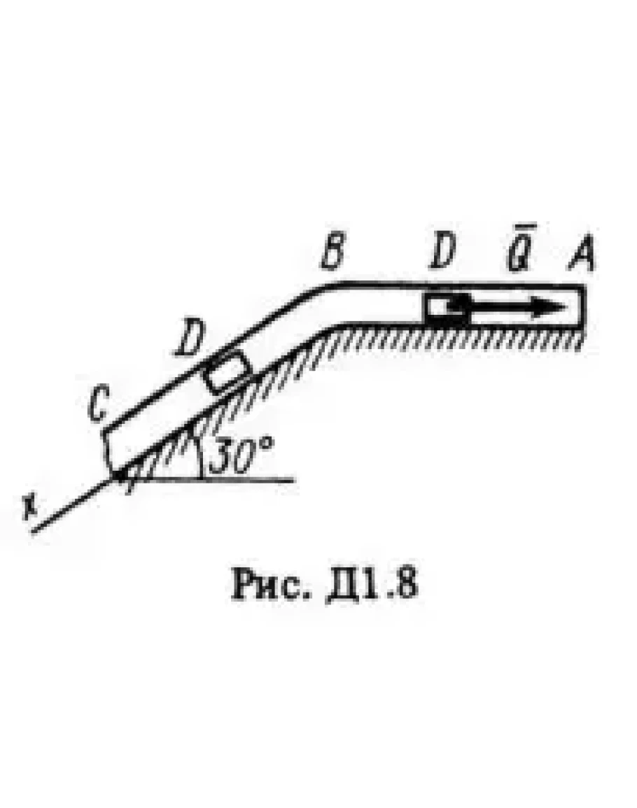 Груз D массой m, получив в точке А начальную скорость v0, движется в изогнутой трубе ABC, расположенной в вертикальной плоскости; участки трубы или оба наклонные, или один горизонтальный, а другой наклонный (рис. Д1.0-Д1.9 табл. Д1). На рисунке АВ на груз кроме силы тяжести действуют постоянная сила Q (ее направление показано на рисунках) и сила сопротивления среды R, зависит от скорости груза v (направлена против движения).