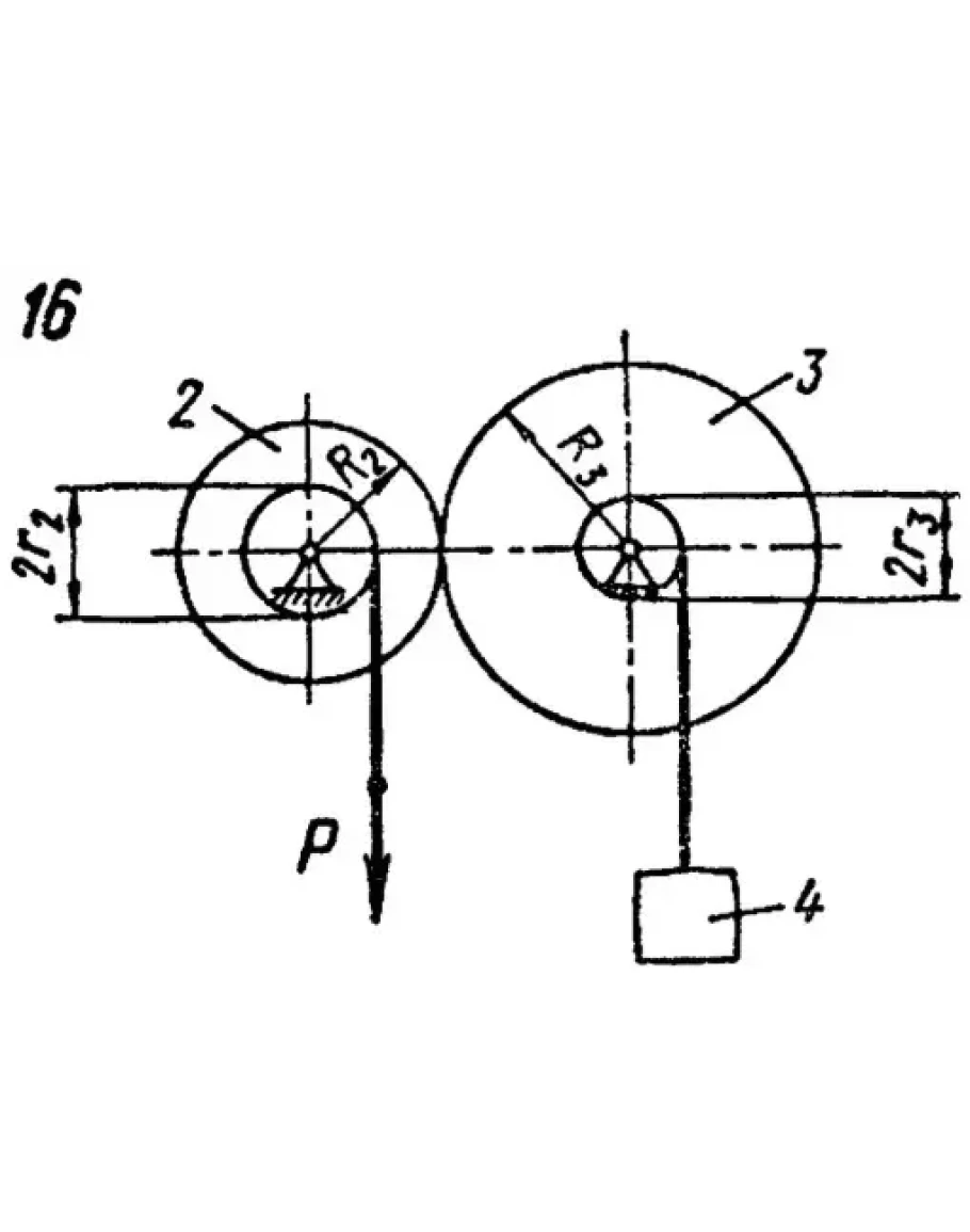 Для заданной механической системы определить ускорения грузов и натяжения в ветвях нитей, к которым прикреплены грузы. Массами нитей пренебречь. Трение качения и силы сопротивления в подшипниках не учитывать. Система движется из состояния покоя.