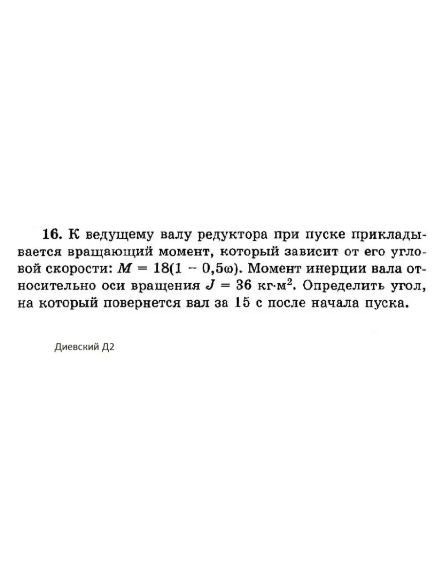 Решение задачи Д2 В16. К ведущему валу редуктора при пуске прикладывается вращающий момент, который зависит от его угловой скорости: М = 18(1 - 0,5w). Момент инерции вала относительно оси вращения J = 36 кгм2. Определить угол, на который повернется вал за 15 с после начала пуска.