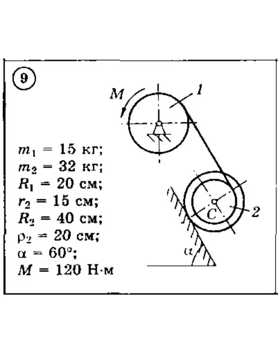 Для приведенных на схемах 1-30 механических систем, используя теорему об изменении кинетической энергии в дифференциальной форме, определить угловое ускорение (варианты 4, 6, 7, 9, 11, 18, 25, 26, 28) или линейное ускорение (остальные варианты) тела 1. Нити невесомы и нерастяжимы. Принятые обозначения: т — массы тел, R и r — радиусы, р — радиус инерции (если он не указан, тело считать однородным цилиндром); при наличии трения указываются f — коэффициент трения скольжения, fк — коэффициент трения качения.