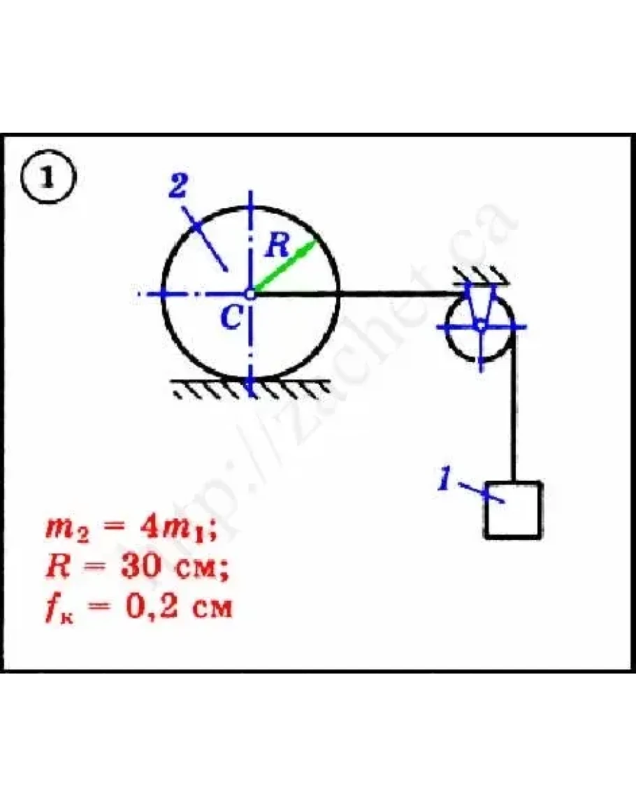 Для приведенной на схеме механической системы, используя теорему об изменении кинетической энергии в дифференциальной форме, определить линейное ускорение тела 1. Нити невесомы и нерастяжимы. Принятые обозначения: m - массы тел, R и r - радиусы, ρ - радиус инерции (если он не указан, тело считать однородным цилиндром); при наличии терния указываются f - коэффициент трения скольжения, fк - коэффициент трения качения.