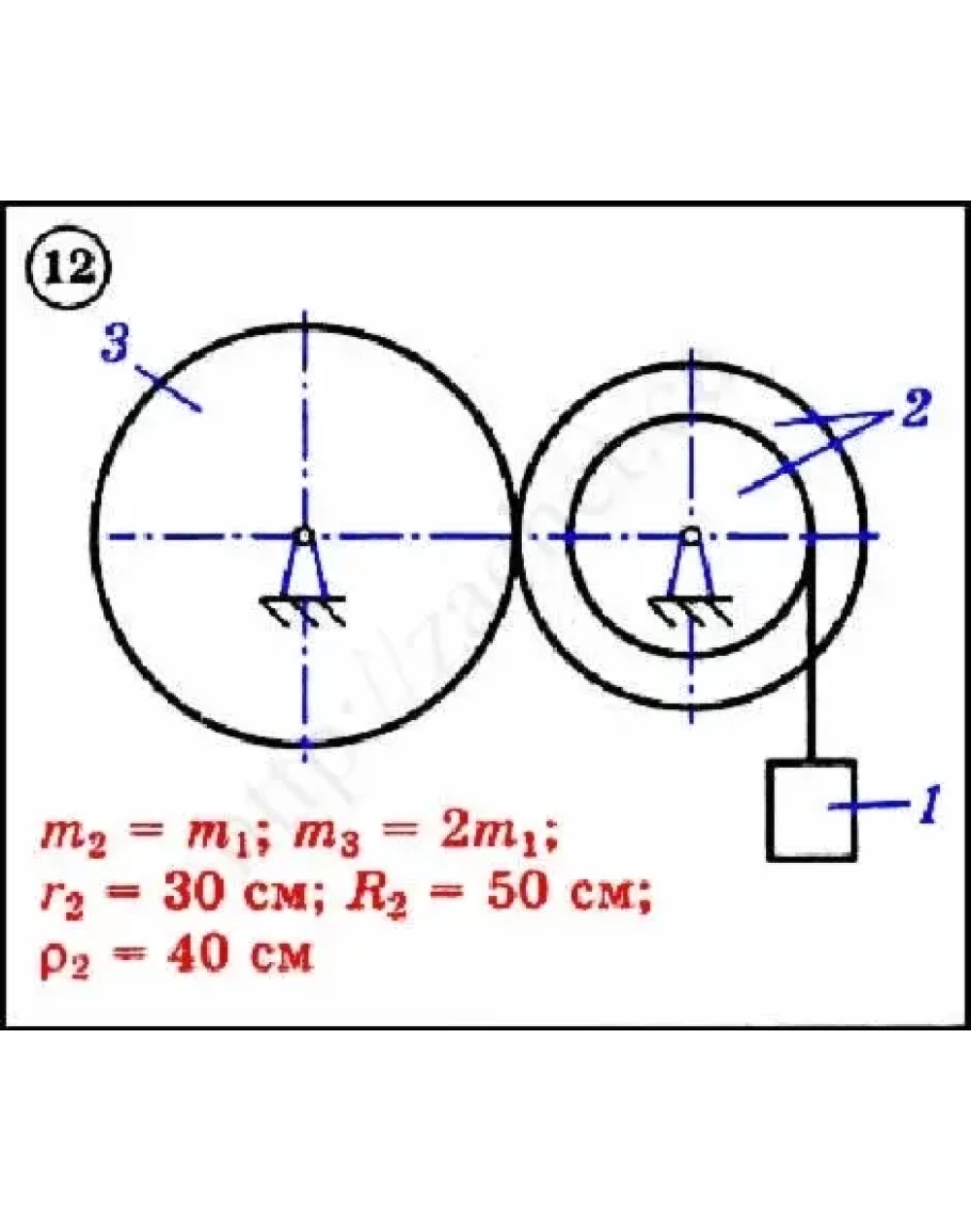 Для приведенной на схеме механической системы, используя теорему об изменении кинетической энергии в дифференциальной форме, определить линейное ускорение тела 1. Нити невесомы и нерастяжимы. Принятые обозначения: m - массы тел, R и r - радиусы, ρ - радиус инерции (если он не указан, тело считать однородным цилиндром); при наличии терния указываются f - коэффициент трения скольжения, fк - коэффициент трения качения.