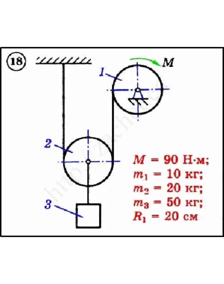 Для приведенной на схеме механической системы, используя теорему об изменении кинетической энергии в интегральной форме, определить линейную скорость тела 1 после его заданного перемещения φ1 = 2π рад или s1 = 2 м. Движение начинается из состояния покоя.