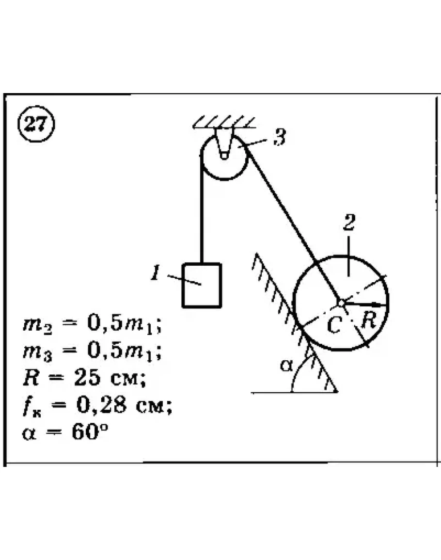 Для приведенных на схемах 1-30 механических систем, используя теорему об изменении кинетической энергии в дифференциальной форме, определить угловое ускорение (варианты 4, 6, 7, 9, 11, 18, 25, 26, 28) или линейное ускорение (остальные варианты) тела 1. Нити невесомы и нерастяжимы. Принятые обозначения: т — массы тел, R и r — радиусы, р — радиус инерции (если он не указан, тело считать однородным цилиндром); при наличии трения указываются f — коэффициент трения скольжения, fк — коэффициент трения качения.