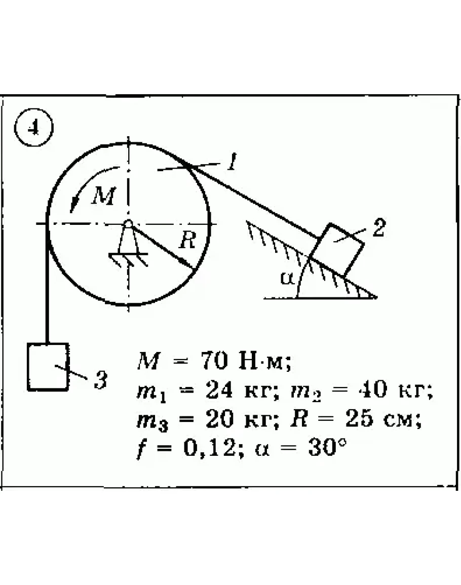 Для приведенных на схемах 1-30 механических систем, используя теорему об изменении кинетической энергии в дифференциальной форме, определить угловое ускорение (варианты 4, 6, 7, 9, 11, 18, 25, 26, 28) или линейное ускорение (остальные варианты) тела 1. Нити невесомы и нерастяжимы. Принятые обозначения: т — массы тел, R и r — радиусы, р — радиус инерции (если он не указан, тело считать однородным цилиндром); при наличии трения указываются f — коэффициент трения скольжения, fк — коэффициент трения качения.