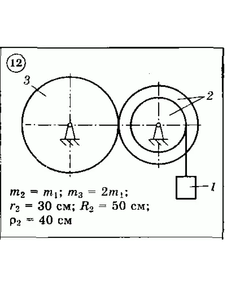 Для приведенных на схемах 1-30 механических систем, используя теорему об изменении кинетической энергии в дифференциальной форме, определить угловое ускорение (варианты 4, 6, 7, 9, 11, 18, 25, 26, 28) или линейное ускорение (остальные варианты) тела 1. Нити невесомы и нерастяжимы. Принятые обозначения: т — массы тел, R и r — радиусы, р — радиус инерции (если он не указан, тело считать однородным цилиндром); при наличии трения указываются f — коэффициент трения скольжения, fк — коэффициент трения качения.