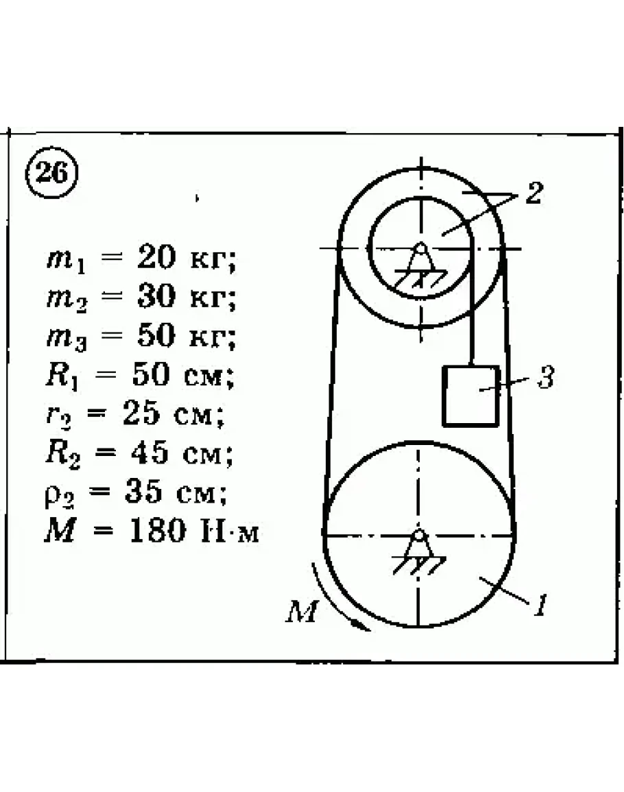 Для приведенных на схемах 1-30 механических систем, используя теорему об изменении кинетической энергии в дифференциальной форме, определить угловое ускорение (варианты 4, 6, 7, 9, 11, 18, 25, 26, 28) или линейное ускорение (остальные варианты) тела 1. Нити невесомы и нерастяжимы. Принятые обозначения: т — массы тел, R и r — радиусы, р — радиус инерции (если он не указан, тело считать однородным цилиндром); при наличии трения указываются f — коэффициент трения скольжения, fк — коэффициент трения качения.