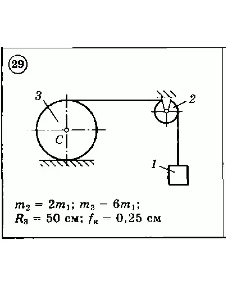 Для приведенных на схемах 1-30 механических систем, используя теорему об изменении кинетической энергии в интегральной форме, определить угловую скорость (варианты 4, 6, 7, 9, 11, 18, 25, 26, 28) или линейную скорость (остальные варианты) тела 1 после его заданного перемещения Фи1 = 2пи рад или S1 = 2 м. Движение начинается из состояния покоя.