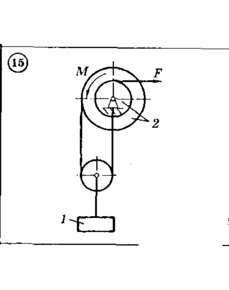 Д4 ЗАДАНИЕ 2: Для представленных на рисунках схем 1-30, используя принцип Лагранжа, определить величину силы F (при наличии трения — максимальное значение этой величины), при которой механическая система будет находиться в равновесии. Исходные данные: вес груза G1 = 20 кН, вращающий момент М = 1 кН*м, радиус барабана R2 = 0,4 м (у двойного барабана имеется также r2=0,2 м), угол а = 30° и коэффициент трения скольжения f = 0,5. Ненумерованные блоки и катки считать невесомыми. Трением на осях барабана и блоков пренебречь.