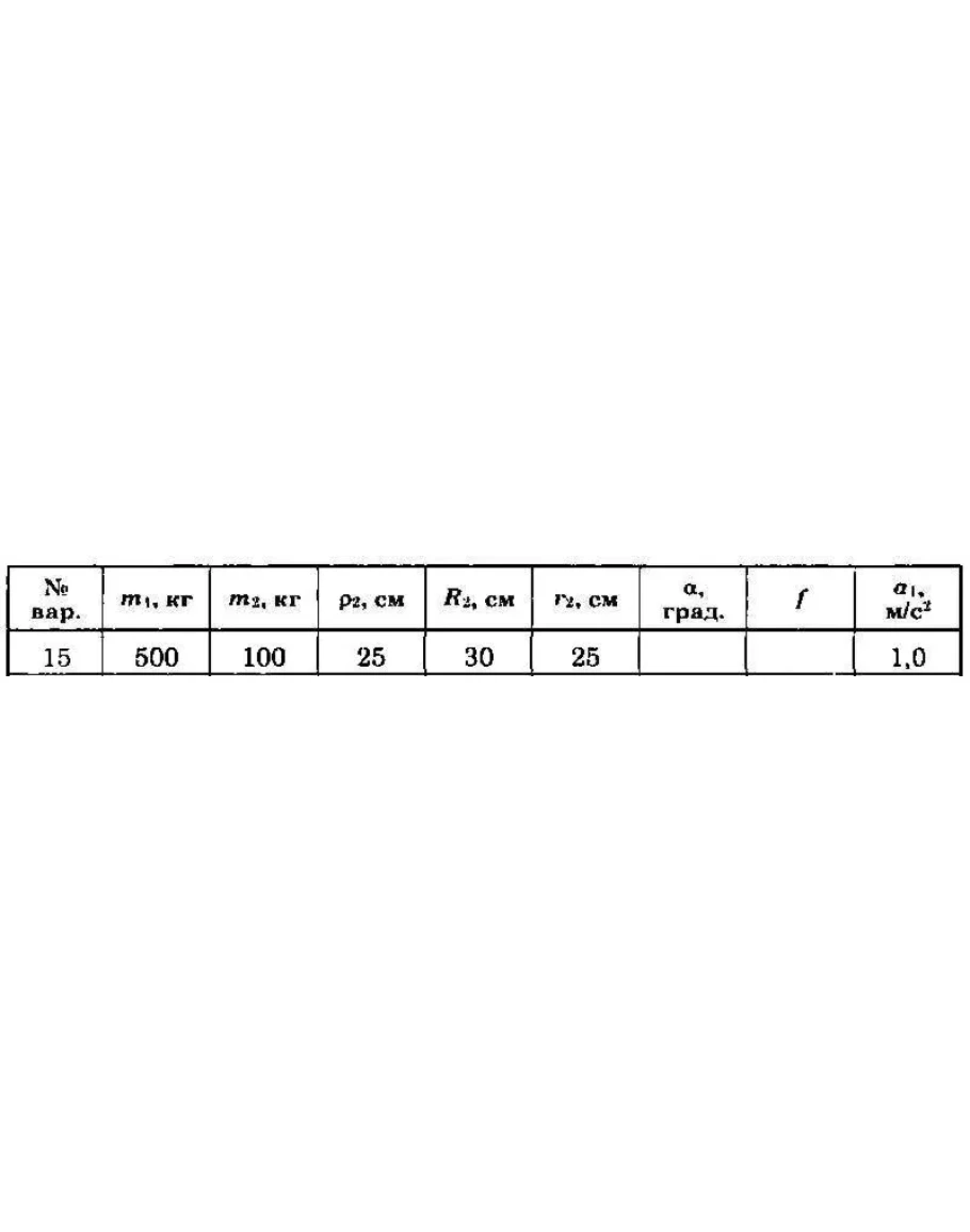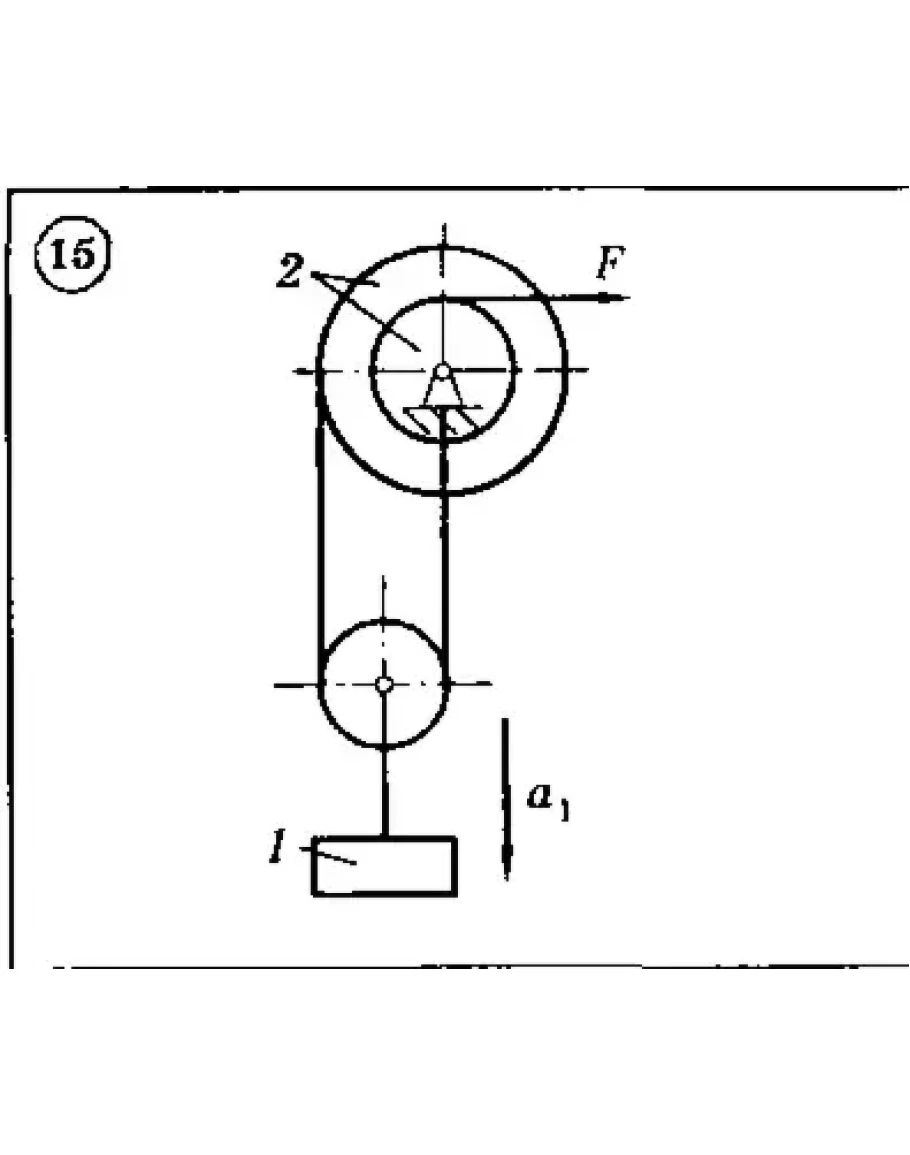 Для приведенных на схемах 1-30 механических систем, используя принцип Даламбера, определить величину силы F,необходимую для перемещения груза с заданным ускорением а1, а также усилие в грузовом тросе. Исходные данные: массы груза т1 и барабана т2, радиус барабана R2 (у двойного барабана имеется также r2), его радиус инерции р2 (если он не указан, тело считать однородным цилиндром), угол а и коэффициент трения скольжения f приведены в таблице. Непронумерованные блоки и катки считать невесомыми. Трением на осях барабана и блоков пренебречь.