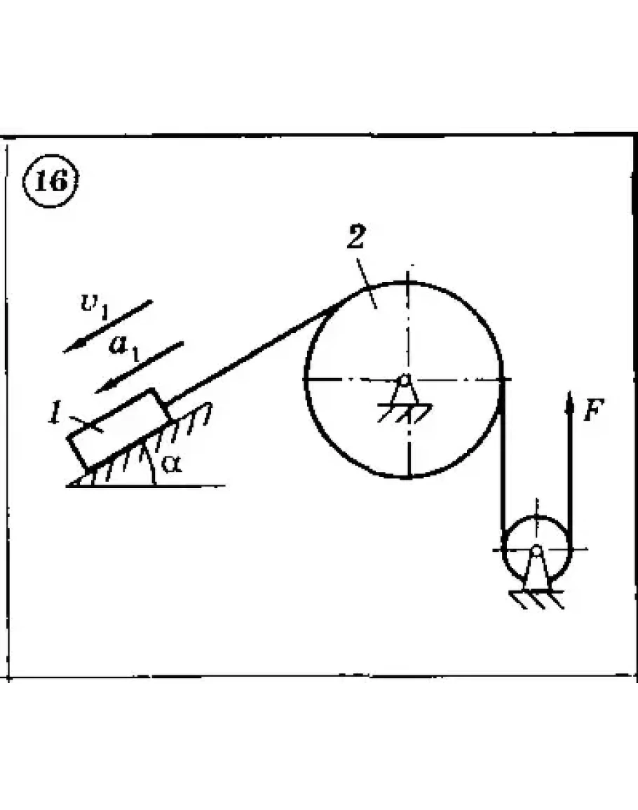 Для приведенных на схемах 1-30 механических систем, используя принцип Даламбера, определить величину силы F,необходимую для перемещения груза с заданным ускорением а1, а также усилие в грузовом тросе. Исходные данные: массы груза т1 и барабана т2, радиус барабана R2 (у двойного барабана имеется также r2), его радиус инерции р2 (если он не указан, тело считать однородным цилиндром), угол а и коэффициент трения скольжения f приведены в таблице. Непронумерованные блоки и катки считать невесомыми. Трением на осях барабана и блоков пренебречь.