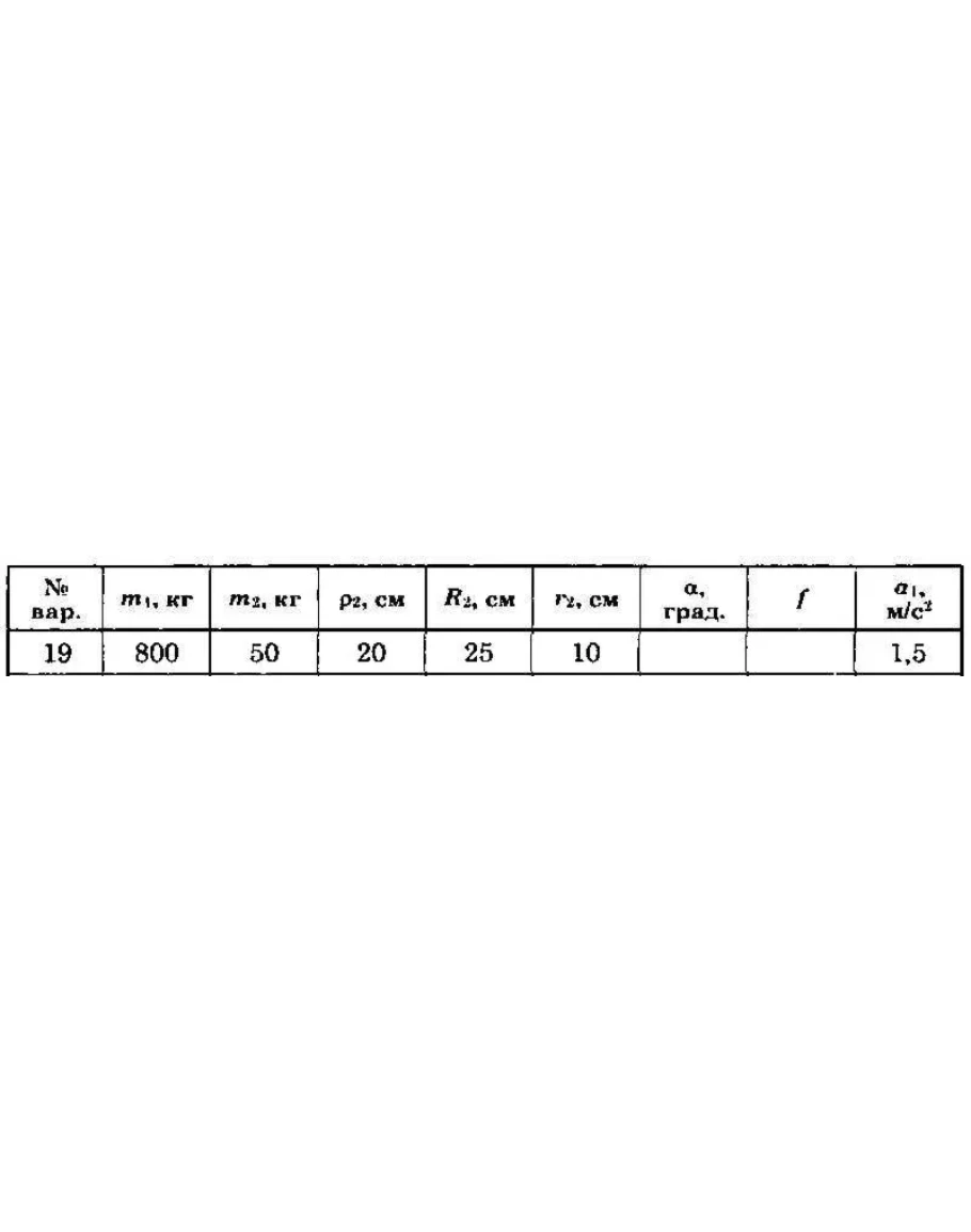 Для приведенных на схемах 1-30 механических систем, используя принцип Даламбера, определить величину силы F,необходимую для перемещения груза с заданным ускорением а1, а также усилие в грузовом тросе. Исходные данные: массы груза т1 и барабана т2, радиус барабана R2 (у двойного барабана имеется также r2), его радиус инерции р2 (если он не указан, тело считать однородным цилиндром), угол а и коэффициент трения скольжения f приведены в таблице. Непронумерованные блоки и катки считать невесомыми. Трением на осях барабана и блоков пренебречь.