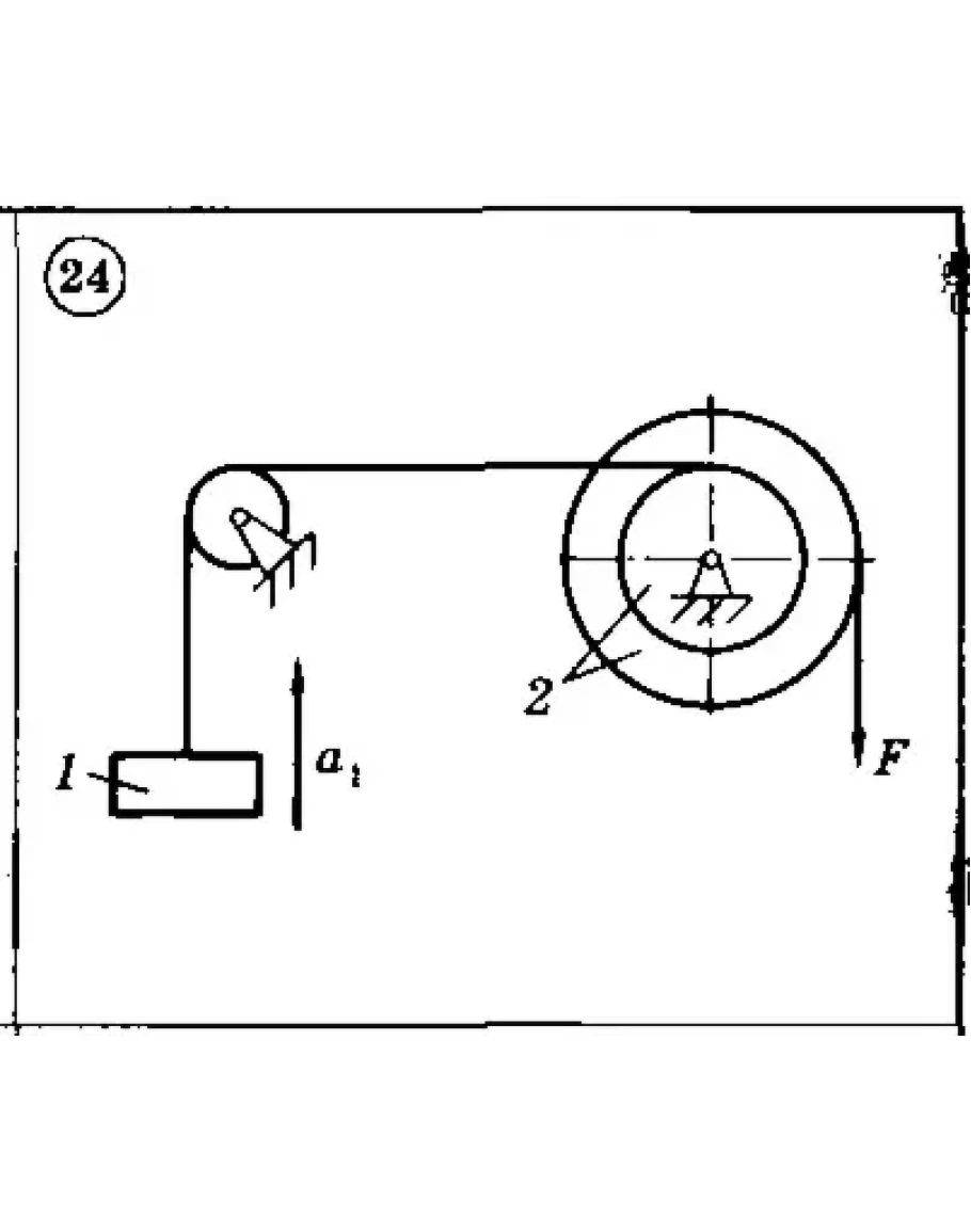 Для приведенных на схемах 1-30 механических систем, используя принцип Даламбера, определить величину силы F,необходимую для перемещения груза с заданным ускорением а1, а также усилие в грузовом тросе. Исходные данные: массы груза т1 и барабана т2, радиус барабана R2 (у двойного барабана имеется также r2), его радиус инерции р2 (если он не указан, тело считать однородным цилиндром), угол а и коэффициент трения скольжения f приведены в таблице. Непронумерованные блоки и катки считать невесомыми. Трением на осях барабана и блоков пренебречь.