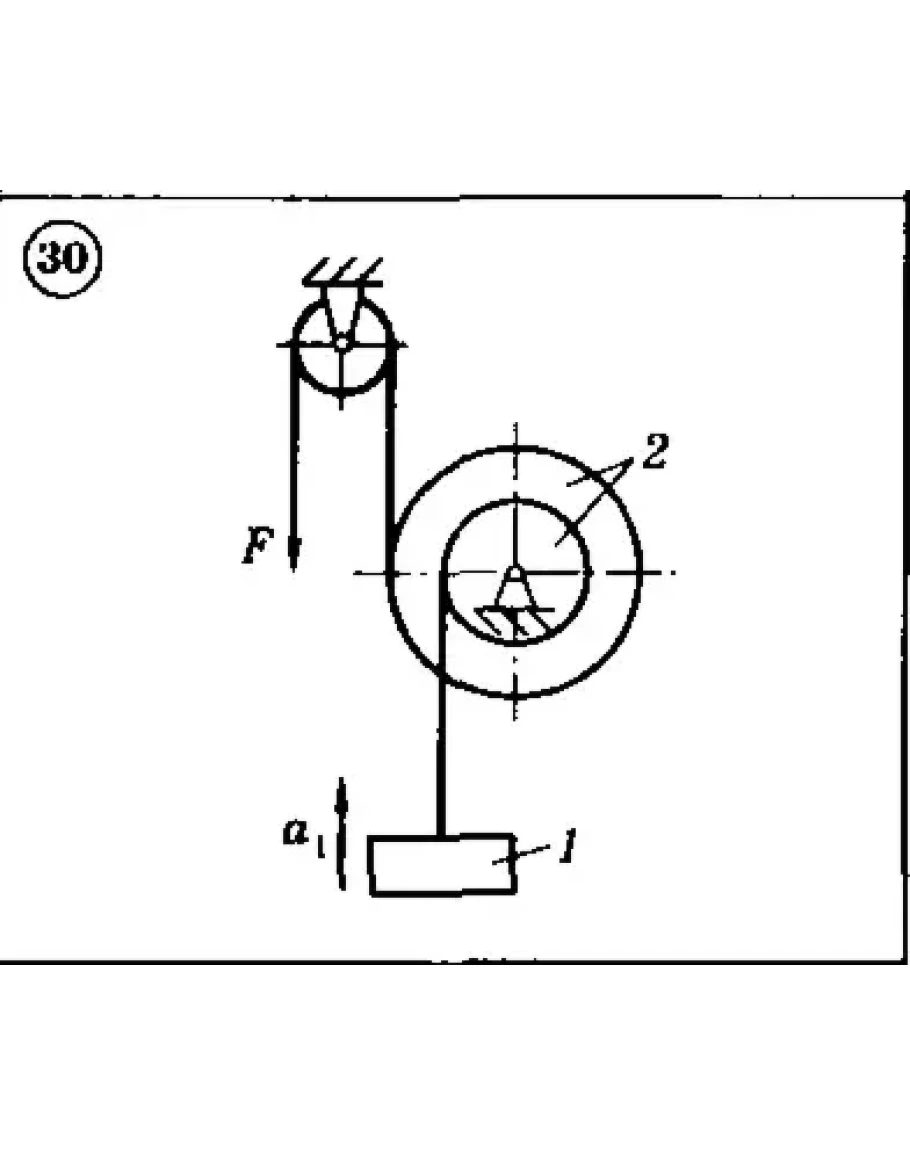 Для приведенных на схемах 1-30 механических систем, используя принцип Даламбера, определить величину силы F,необходимую для перемещения груза с заданным ускорением а1, а также усилие в грузовом тросе. Исходные данные: массы груза т1 и барабана т2, радиус барабана R2 (у двойного барабана имеется также r2), его радиус инерции р2 (если он не указан, тело считать однородным цилиндром), угол а и коэффициент трения скольжения f приведены в таблице. Непронумерованные блоки и катки считать невесомыми. Трением на осях барабана и блоков пренебречь.