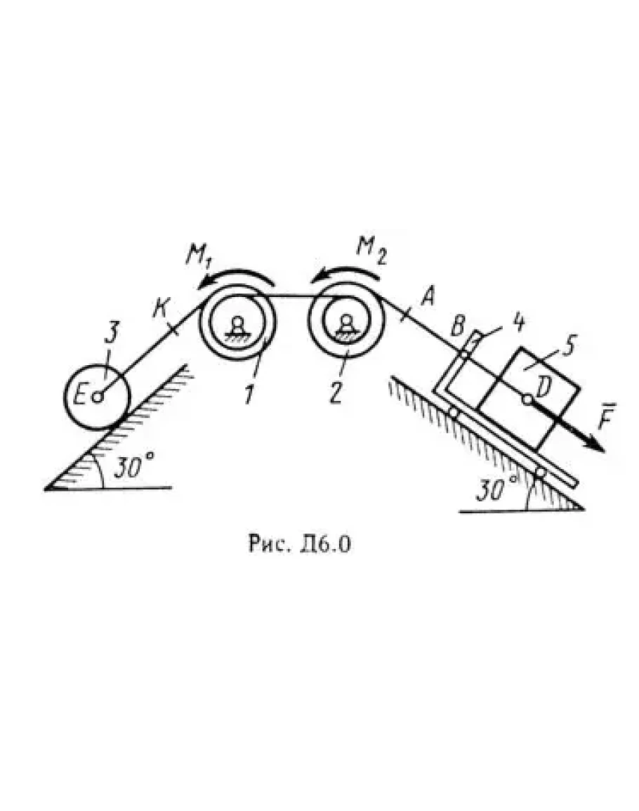 Решение задачи Д6 Вариант 00 по теормеху из методички Тарга С.М. 1988 года (Также совпадает с задачей Д8 Тарг 1983). Сверьте условие к задаче Д6 (стр. 56 в методичке Тарг С.М.): Механическая система состоит из тел 1, 2, 3, 4, 5, имеющих веса Р1, Р2, Р3, Р4, P5 соответственно; тела системы связаны нитями, намотанными на ступенчатые блоки 1 и 2 (рис. Д6.0-Д6.9, табл. Д6). Прочерк в столбцах таблицы, где заданы веса, означает, что соответствующее тело в систему не входит (на чертеже не изображать), а ноль в столбцах таблицы означает, что тело считается невесомым, но в систему входит (на чертеже должно быть изображено). Для колес, обозначенных номером 4, Р4 - их общий вес (вес платформы такой тележки не учитывается). Радиусы ступенчатых блоков 1 и 2 равны соответственно: R1=R, r1 = 0,8R; R2 = R, r2 = 0,4 R. При вычислении моментов инерции оба блока, колеса и катки считать однородными цилиндрами радиуса R. На систему кроме сил тяжести действуют сила F. приложенная к телу 4 или 5 (если тело 5 в систему не входит, сила приложена в точке В к тележке), и пары сил с моментами М1 и М2, приложенные к блокам (при М < 0 направление момента противоположно показанному на рисунке). На участке нити, указанном в таблице в столбце "Пружина", включена пружина с коэффициентом жесткости с (например, если в столбце стоит АВ, то участок АВ является пружиной, если AD то AD пружина, и т.д.) ; в начальный момент времени пружина не деформирована. Составить для системы уравнения Лагранжа и определить из них частоту и период колебаний, совершаемых телами системы при ее движении.
